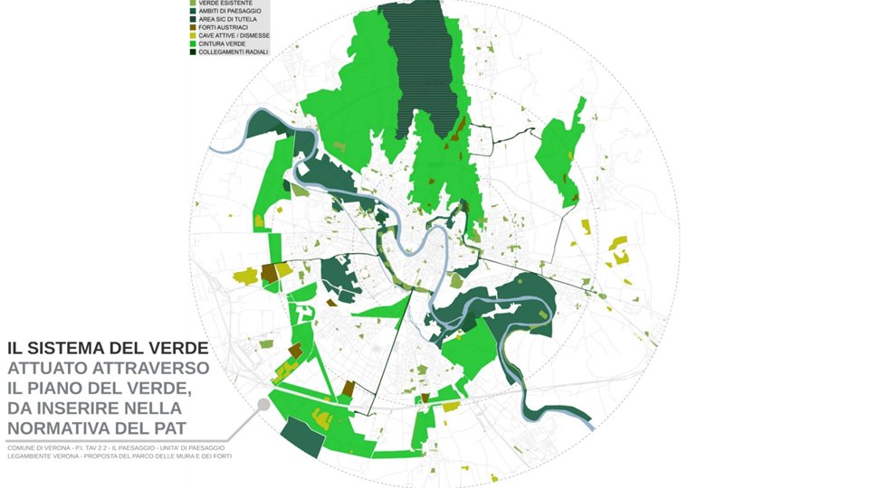 Sarebbe un anello verde all’esterno della cinta fortificata cittadina che, con i cosiddetti “raggi verdi”, potrebbe collegare le fortificazioni dei campi trincerati asburgici, le antiche corti agricole e le cave, sia quelle dismesse, che quelle attive ma destinate alla chiusura e i parchi naturalistici in essere o in progetto.